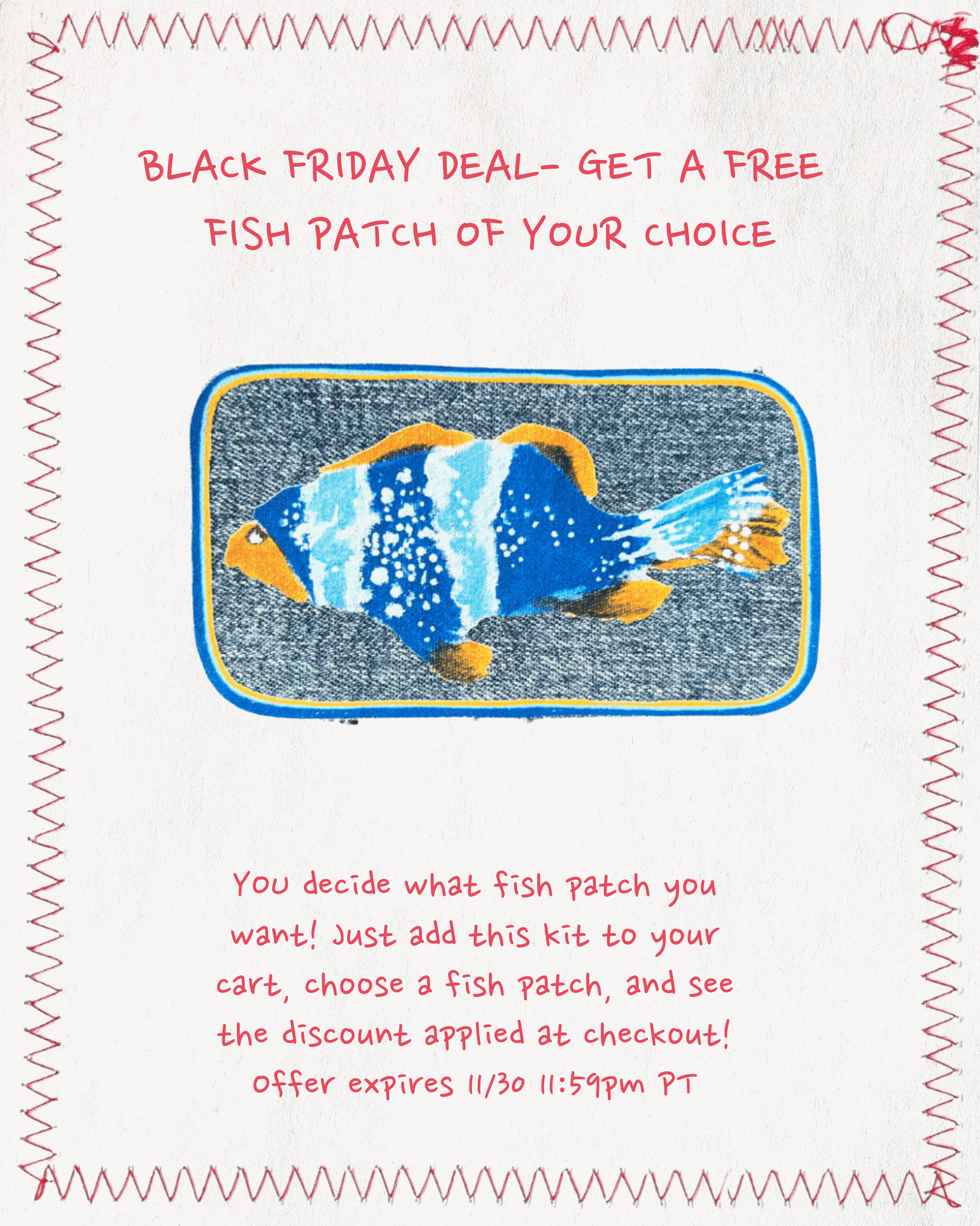 Plus, for Black Friday weekend ONLY, get a FREE fish patch of your choice with your purchase of a kit. Just add this kit and a fish patch of choice to your cart & get your patch for FREE! Discount auto-applied at checkout. Offer expires 11/30 11:59pm PT.